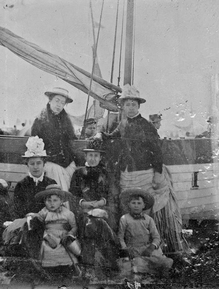 There is a complication in assessing smocks in that boys also wore tunics at mid-century. And it is difficult in some images to tell if the boys are wearing a smock or a tunic. Some images at mid-century are not as clear as later imagery. Smocks were a protective garment while tunics while plain were not prorecting the clothes worn underneath. Although the tunic was seen as a school garment, erhapless exprensive thn a suit jacket. This may provide some clues as to whether we are looking at a smock or tunic. Unfortunately so few photographs were taken outside the studio, but they are a few. Interestngly, while there is a much larger American hotographic record in the mid-19th century, there do seem to be more British photographs taken outside the studio. We arenot sure why. We notice one tin-type of an unientified family about to take a boat ride. We think the children may be wearing smocks rather than tunics.