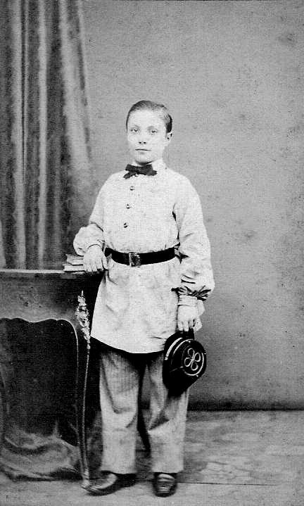 We sudenly have much more informtion on French tunic suits in the 860s. Thecreaon of course is the popularity ofvthe CDV. The albumen process and the CDV was deveoped in the mid-1950s, but for some reason did not become popular until the 1860s. Syddenly we see portais being done in unprecedented mumbers. Tunic outfits seemned to have been a popular style for French boys in the 1860s. Some tunics buttoned at the fromt ad were worn with bows. The tunic sleeves in the early-60s might blouse, but not like the ines we see in the 50s. The tunic and pants were done with both different and like-colored pants. We are mot yet sure which was more common. The tunics seem mostly short lengths. The lengths varied. A common lehgth was halfway between the waist and knee, looking somewhat like long shirts. They were often worn with belts, giving a military look. Most tunic suits were done with long pants. We notice both plain tunic suits as well as some done with a range of fancy detailing. The tunic suit we see in the early 60s seem rather plain, but we see more elaborate detailing by the end of the decade. We are still working on the age ranges. The boys eweating tuics seem to be pre-teen ages.