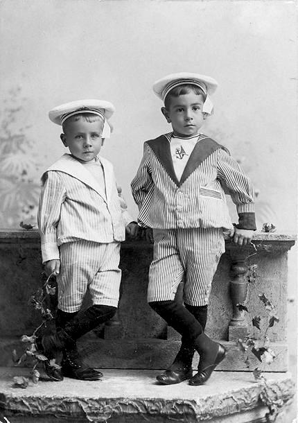 We notice some American sailor suits done as patterns. This was motly stripes. The ones we notice are summer suits. From a distance they look like light-colored suits. They seem to be white suits with thin colored stripes. Blue stripes were the most common, but they were not the only stripe color. This can not be determined from the photographic record, but we can find color information in the mail-order catalogs that had become very popular by the 1890s. These stripe suits were very popular for summerwear in the 1890s. There were other patterns, but none were nearly as common as the stripe suits. The stripes were done on both the blouse and pants. The 'V' sailor collar was often not striped, but a solid color for contrast. The dickey also was not done in the striped material. We notice the striped suits worn without the scarves. We are not sure if this was very common.