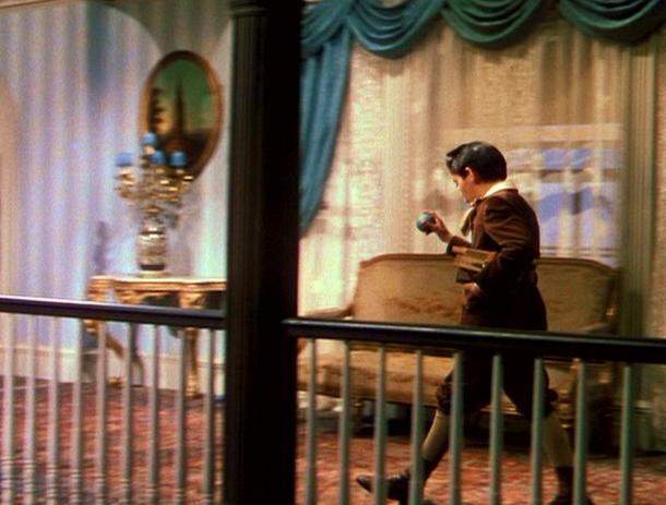 Henry's son Jack briefly appears at the end of the film. He appears in one scene as a child of about 10 years. I think the period is the early 1920s. He wears a brown Norfolk style suit with knickers, and high top shoes. I had thought that he was wearing kneesocks, but a HBC reader assures me that he is wearing long stockings. Our reader writes, "I'm sure he is wearing tan long stockings and not knee socks. Look closely at the knees." Also note the tan color. After World War I these tan or other shades of light brown stockings became increasingly common. The material looks like velvet, but I think a suit in this style swould be more likely to be made in corduroy. Jack wears a bow instead of a tie and a small white collar. The suit is the collar buttoning style, not the more modern style with lapels. That does not look right to me for the 1920s or even the 1910s. If Jack is set in the 1900s the jacket style might be correct, but then I think he would be more likely to wear kneepants and long stockings. This is a little complicated because I have seen that jacket style as late as the early 20s, but I think it was not nearly as common as the more modern style with lapels. The suits we have noted with this jacket style had kneepants rather than knickers.