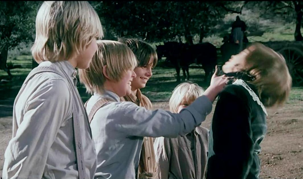 The first years of 'Little house on the prarie' were full of girls, but Michael Landon eventually added a boy to the series presumably to broaden its appeal. In one 1978 episode a spoiled Eastern boy makes a one-time appearance. He was expelled from his pretigiousv military school. For some reason many American privare schools were military schools. His uniform was not like the uniforms of actual Ameican miltary schools. He was sent to live with his uncle. This of course was the store keeper with his obnoxious wife. The wife of course is the perfect overbearing female to put a boy in the hands of. The nephew arrives in a velvet suit and lace collar. The episide is 'The Stranger' (S4E19). The suits in his episide are obviously meant to be a Fauntleroy suit. The lady soon has her son in a similar velvet suit, to the boy's great horror. She orders it by mail. Period mailorder catalogs were full of Fasuntlerroy outfit offerings. She rushes up to Wille's room with his new suit so he can try it on. Willie of course is agast. In another scene he purposefully gets into a fight with the local boys knowing what will happen. They rip the suit off him, ruining the suit and slap him with mud. The bullies who attack Willie even call him 'His Lordship'. The episode is set in 1876, while Little Lord Fauntleroy was not published until 1885. The suits the boys wear have very modest collars, nothing like the Fauntlroy collasrs appearing in 1885. One fan writes, "Walnut Grove was ahaead of its time." But boys wore fancy velvet suita before the advent of 'Little Lord Fauntleroy'. The cosuming in LittleLord Fauntleroy is generally correct. We begin to see younger American boy wearing knee pamys (1860s) and they gradually grew in popularity, but mostly with fashionable city families. We begin to see boys in rural areas wearing knee pants, but the dashion was slower to castch on han in rural areas and less common with older boys even wnen knee oants became sandard in the cities. Peter Billingsly, Clay O'Brian, Matthew Labrouioux (young Charles).