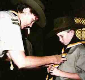 Figure 2.--This Cub is being invested by a Group Leader. You can see the Australian style hat, the group scarf, and the "it'll fit for a few years yet" shirt. There are no badges yet on his shirt. |