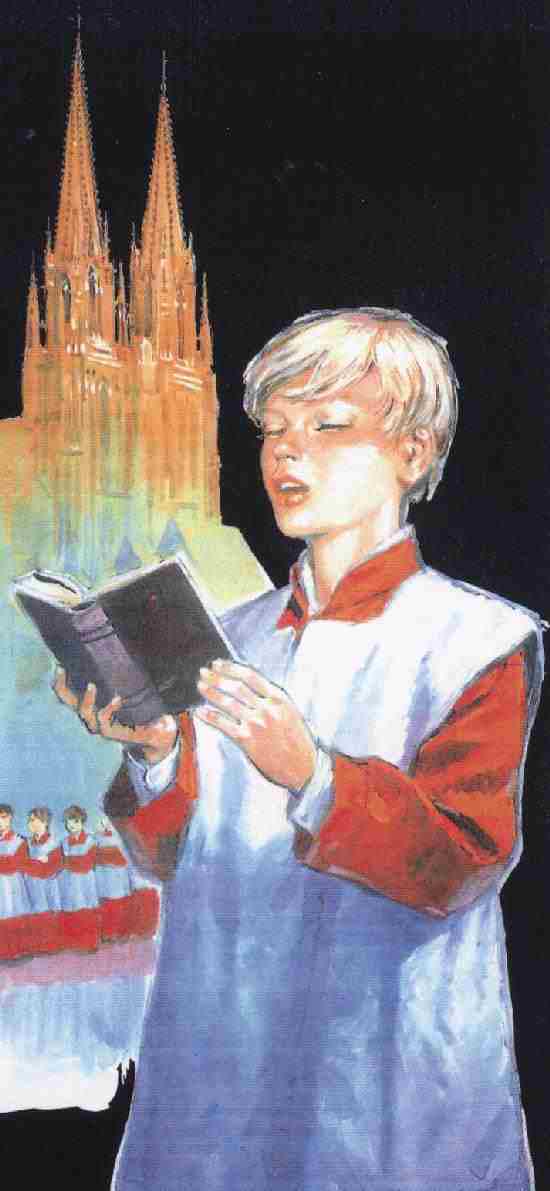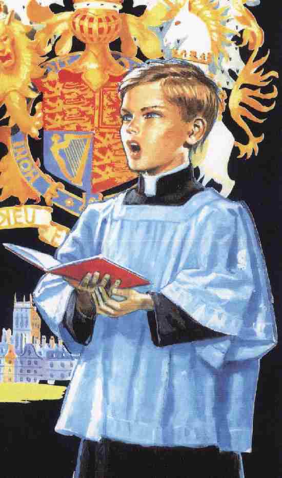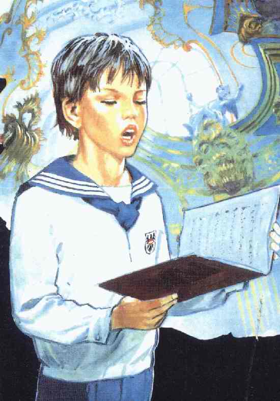 Eclesiastical vestments: This choir wears another type of ecelesiastical vestments. A French reader tells HBC that this image portrays a German choir. The boy depicted certainly looks German. Our French reader reports that this is one of the best boy choir in the whole world--the Regensburger Domspatzen. Their uniform is clearly depicted in the drawing. They are known as "the sparrows" (les moineaux) of the Regensburg Cathedral. There are two other towns in Bavaria (Bayer) with important boys choirs: Tölz and Windsbach.