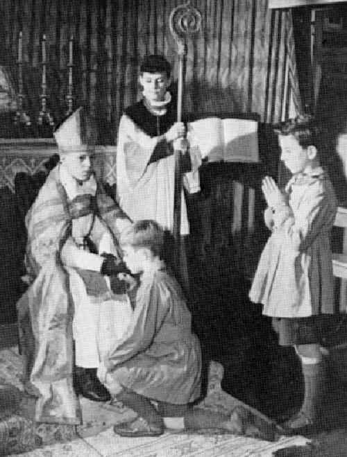 We note a popular tradition at the school during the Christmas reason was the selection and ceremonies associated with a Boy Bishop. The Boy Bishop tradition had been a very common tradition throughout Midieval Europe, including England. The Church and Government authorities attempted to suppress the custom. We note, however, that is was a popular tradition at the St. Mary of the Angles Sog School. We are not sure to what extent it was practiced at other English schools. The boys here wear smocks which was the school uniform. he Boy Bishop here is shown with his boy attendants including a chaplin.