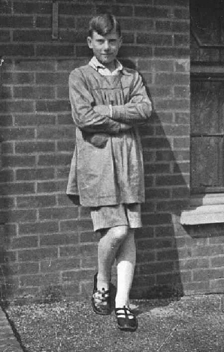 The boys and wore a practical blue smock as their every day school uniform. The boys called it a "blue coat", although it was more like a smock than the tunic-like garments worn at the Blue Coat Schools. The smocks were very plain. All we notice is a single line of detailing accross the chest. We note minor differences overvtime in the smocks that the boys wore. Some of the back buttoning smocks had a front button for the waistband. Some smocks had the school badge worn on the left chest, although this appears to be an addition in the 1960s. Earlier photographs show the boys without the badge. There were also buttons on the shoulders of some of these smocks. The boy here (figure 1), for example, does not have the school badge on his smock or the shoulder buttons. The smocks had a cut away square collar so the shirt collar and ties showed. Some of the smocks had a small front pocket, but many did not have these pockers. The smocks looked more like a French than an English school uniform. HBC knows of no other English schools, except schools for very young boys, where smocks were worn. A European reader asks, "In this land of tradition where smocks were realtively unknown for school children, what is the origin of such a unusual uniform. Do we know who designed the uniform? Did Desmond Morse-Boycott spend some time in France or Italy in his double definition of priest and choir conductor, from where he would have imported this notion of protective uniform?" Unfortunately, HBC does not know the answer to these questions. Hopefully some of the choristers can tell us something about the school. One reader tells us, "I think the smocks were the idea of the founder, the Reverend Desmond Morse-Boycott, but I am not sure just why he selected smocks for the choristers." A former chorister tells us, "The smocks you refer to were actually called 'Bluecoats' and it was the everyday wear when in school, but not when we attended the local school for