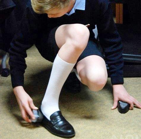 Most French choirs had black leather shoes as part of the uniform, usually worn with white knee socks. Many of the choirs had the boys wear loafers rather than lace up shoes. We are not sure why liafers were preferred. The boys were expcted to have their shoes well polished for their concerts. Thre were rules about feet, much as there were rules bout hands. The boys were instructed as to how to place their feet. This was to both cut down on distractive movements as ell as t give the choir a uniform look. A chorister tells us, "We are told to make sure our shoes touch each other, so we are able to keep our feet together when we are nervous. As we wear short pants on stage, we are shy sometimes, especially during a solo. As we may be nervous and shy, sometimes our knees will bend or we will fidgit a little. If the audience is below, they can see our leg movements very clearly, so we put our feet together to prevent from moving too much. Sometimes older boys still fidgit a little because they feel shy wearing shorts or younger boys bend their knees because they are tired from standingfor such along time. But I think another reason we are taught to keep our feet together is because we are supposed to look the same when we stand, so it is a standard position we must follow."