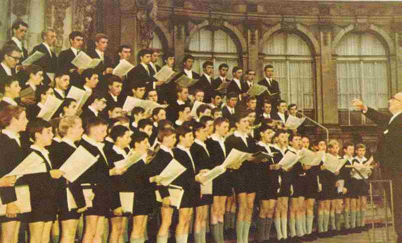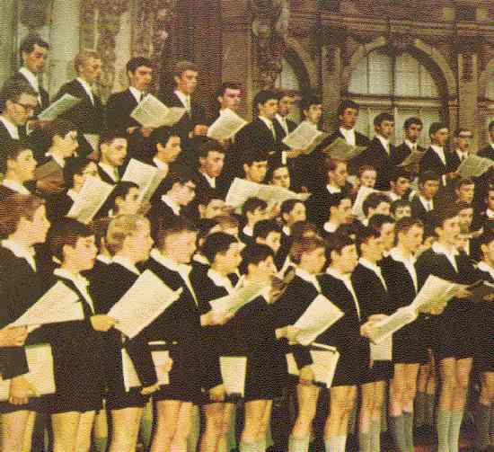 The Dresdner Kreuzchor (Holy Cross Choir) is one of the oldest and most renowned boys' choirs in the world. Even though Dresden was located in East Germany, the Communist Government allowed the Choir to continue operating during the Cold War. The Dresdener Kreuzchor is composed of young men and boys. Based on a record jacket, a HBC reader reports that the young men wear a white shirt and a black suit with a tie. The boys a white shirt with a black jacket and short trousers with grey kneesocks. This might be a travelling suit, but the sourroundings in the picture are rather ecclastical. The picture is a historical one, taken while the GDR still exsisted (before 1990). From 1930 to around 1967 they were directed by Mr. Rudolf Mauersberger, so the record might be from the 1950s or 60s. We have developed information on the history and tradition of the Kreuzchor and also into the life of its members, the "Crucians".