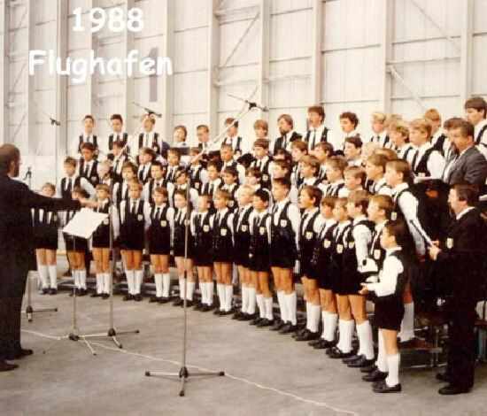Figure 1.--The Knabenchor Marianum Fulda Choir is seen here at Flughaven in 1988 wearing their uniform of white white shirts, dark ties, dark vests, dark short pants, and white kneesocks. This was the last year that they peformed in this costume. |