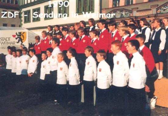 Figure 1.--The Knabenchor Marianum Fulda Choir is seen here in 1990 at a choir competition. They are wearing their new red jacket costume. The are picture with choristers from two other choirs. |