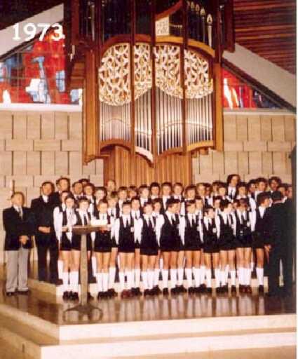 The choir in the 1970s adopted a vest, apparently in 1973. They were dark blue or black vests matching the short pants. The vest was worn with the choir crest. It has a yellow background. We have noted some photographs in which the boys appear to be wearing very large crests on their vests. The choir wore the vest with short pants and white kneesocks until 1988. The vests in 1988 were replaced with short red jacket.