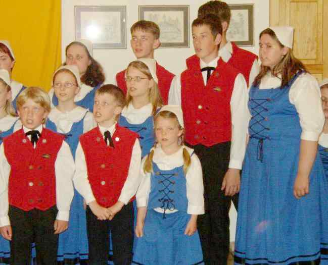 There has been little change over time. The boys stopped wearing neatly tied bows, but continued to wear black scarves. Here you can see the way the boy now wear their scarves. Here they much smaller and worn more like string ties. I'm not sure when this change was made. The Choir changed to long black pants for the boys, I think in the 1980s. The girls now wear the same style of blue dresses, but with longer hems. Notice the black lacing on the girls' dresses. The modern color photograph is especially helpful in understanding the colors in the black and white photographs.