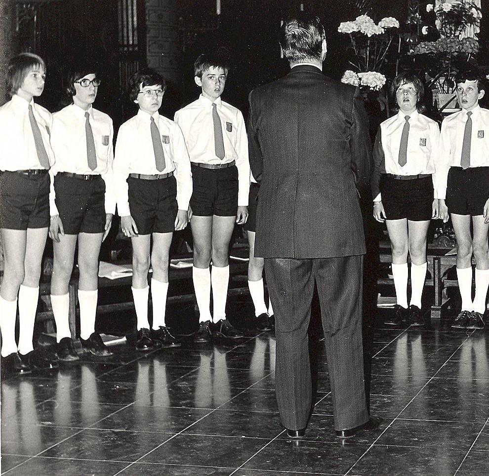 We have found another image of an unidentified choir thar we believe is a German boy choir, in this case a church choir. The boys wear simple uniform of white shirt and tie (possibly red), black or dark blue short pants, white knee socks, and black shoes. The photogrgraph looks to have been taken in the 1970s. There is a shield on their shirts, but it is too small to make out. Other Germans choirs wore similar uniforms which is one of the reasons we think it is German, although it could have been possibly taken in another European country like France or Belgium. It looks like it is a Catholic choir based on the altar behind the boys, a littkle hard to see with all the flowers. The Munchner Chorbuben is a possibility. The choristers there wore bright red sweasters, but the rest of the uniform looks similar.
