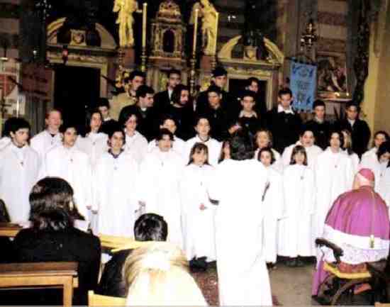 The Pueri Cantores "San Domenico Savio" di Plasencis (Udine) unlike many Italian choirs is an all boys' choir. Like most other current Italian choirs, it was founded relatively recently. The choir was founded in 1990 and is formed from 30 boys. In 1991 it joins the italian federation of Pueri Cantores and in the same year it participates to the National Conference of Udine. On september 19, 1993 it receives the ecclesiastical approval from Bishop Batistes. Its activity is mainly liturgical, participating also in concerts. The Chorus, with its songs, animates the parochial mass and many times also those of the surrounding areas.. In 1992, at the occasion of the visit of the Pope to Udine, the choir has sung together with other groups during the mass celebrated by the Pope. He has participated to the Regional Conferences of Castions di Strada (UD) in 1992, of Loreggiola (PD) also in 1992, of Voltabarozzo (PD) in 1993. In 1994, thanks to the cooperation with the "Caritas Diocesana", it has undertaken a tournée in Hungary with stages that have touched also Austria and the Slovenia; In Budapest the Chorus has sung in the Cathedral of Santo Stefano during the mass celebrated by the Bishop of the city. Beyond having participated to the national conference of Assisi (1995), invited by the "Caritas Diocesana" the choir has participated to numerous charity concerts. In 1996 a friendship relationship is established, thanks to a sistership, with the parish of Grottammare (Ascoli Piceno); here it has animated the solemn mass in the parochial church. In the same year the choir holds the closing concert of the national conference on Problems of the Child (" With the child for the child ") held October 4 in Riva del Garda, with a most successful manifestation. From the beginning of 1997 the choir has participated in numerous liturgical functions and has in preparation, for the Christmas period, beyond to Nativity Sacred Mass, also some Christmas concerts in the near parishes. The choir is directed by the Master Annalisa IANNI. The organist is Francesco RED.