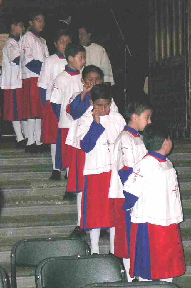 The Metropolitan Cathedral in Mexico City (located on the Zocalo, the city-center plaza across from the capital buildings), is the most famous choir in Mexico. We do not have much information about the choir and its history at this time. The choirboys there still wear short pants. They often perform in short white robes. I think the image here is of the Matropolitan Cathedral Choir (figure 1). They wear red, whire, and blue robes for an Easter 2004 performance. I'm not sure what the significance of the colors is. Hopefully our Mexican readers will provide us some information about the Choir.
