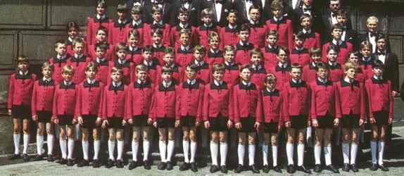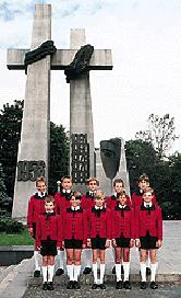 We note the Poznan Nightengales performing in a uniform of short red jackets with black trim, blacl short pants, white kneesocks, and black leather shoes. We are not sure when this uniform was introduced. A Polish reader in 2007 reports, "The Poznan choir Poznan Nightingaels no longer have a short trouers uniform even in summer."