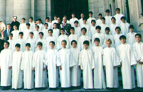 Figure 1.--The Choristers are pictured here in their white choral robes with King Juan Carlos. |