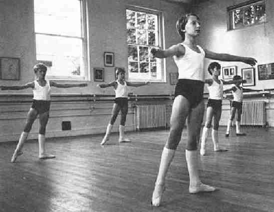 Figure 1.--The practice costume at this classical ballet school is a short"T"-shirt, black tights, and dance shoes. HBC is not sure in which country the school is located. |