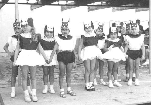 It was apparently part of a Christmas pagent. I'm not positive just what their routine was. The girls wear skirts and the boys wear romper outfits. Rompers in Feance wwere a boys' garment. The image is entitled, "Les petits chats". A French reader writes, "In this photograph, all these childen are French and HBC is quite correct that in France only boys wore rompers at the time. The children here were dressed for the Chrismas day celebration in 1960-61. I know this mine in Senega. It was the Mine de Taïba. It produced potash for agricultue.