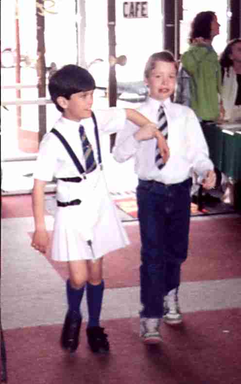 Boys doing Irish dance appear to be more shy about their kilts than boys wearing Scottish kilts. Irish dancers would want to wear their kilts outside of the feis grounds. One observable difference at feises, as compared to Highland Gatherings, is that few of the boys performing at feises come to the feis dressed in their kilt costume or continue wearing it after they have performed. Usually the boys change out of their costumes immediately after performing. Parents bring garment bags for the event. In contrast it is quite common for boys to come to Highland Gatherings in kilts and to wear them all day. A few younger Irish dancers wear their kilts after their performances, but it is not very common.