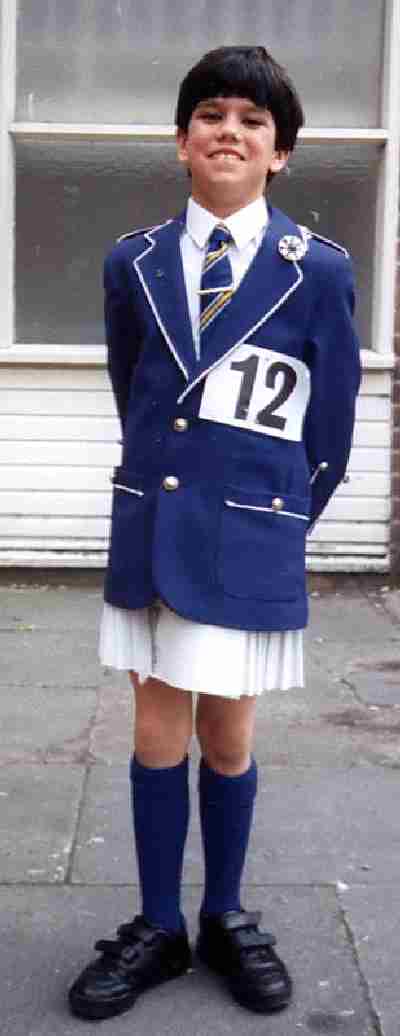 ![]() Figure 1.--This boy wears blue kneesocks to match his jacket. A few boys wear kneesocks to match their kilts. This boy wears turn over top kneesocks. |