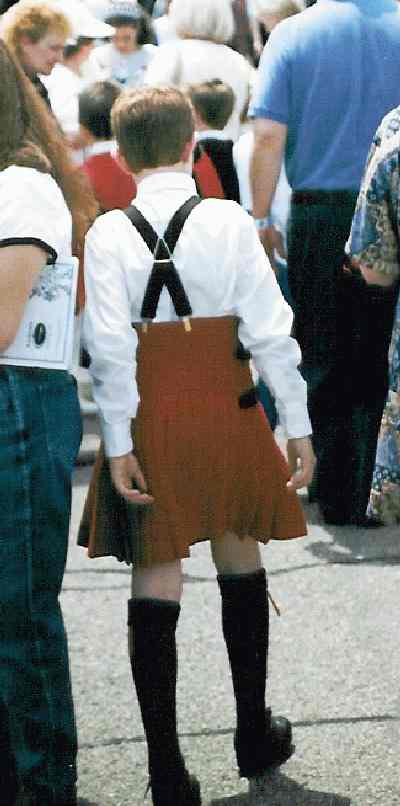 ![]() Figure 1.--Kilts of course do not come with belts, although there are side straps. But given the intensity of the dance, much greater support is needed to keep the kilt in place. Thus virtually all dancers wear suspenders. Notice the black side straps. |
