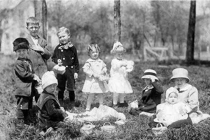 Here we have an unidentified family, we think after an Easter egg hunt. We don't know where the snapshot was taken. It is undated, but looks like the late 1910s to us. The children are wearing their best outfits. They have Easter bskets which presumably were used for a Easter egg hunt. They seem to be having a lottle picnic, although we can't make out just what they ave in their baskets. They wear quite a range of different outfits.
