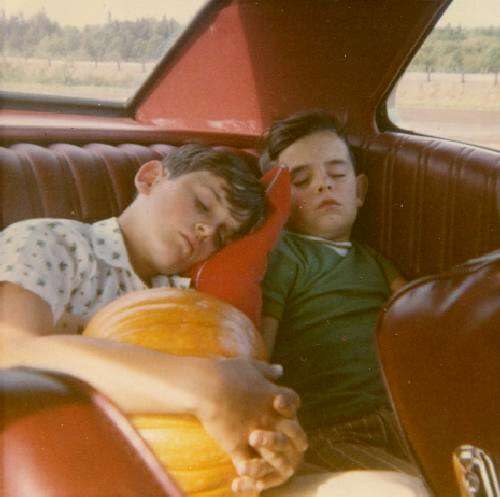 Figure 1.--An important part of a family's Halloween became picking out a pumpkin. Here two brothers probably in the 1960s doze off after a drive into the country tpo get their pumpkin. |