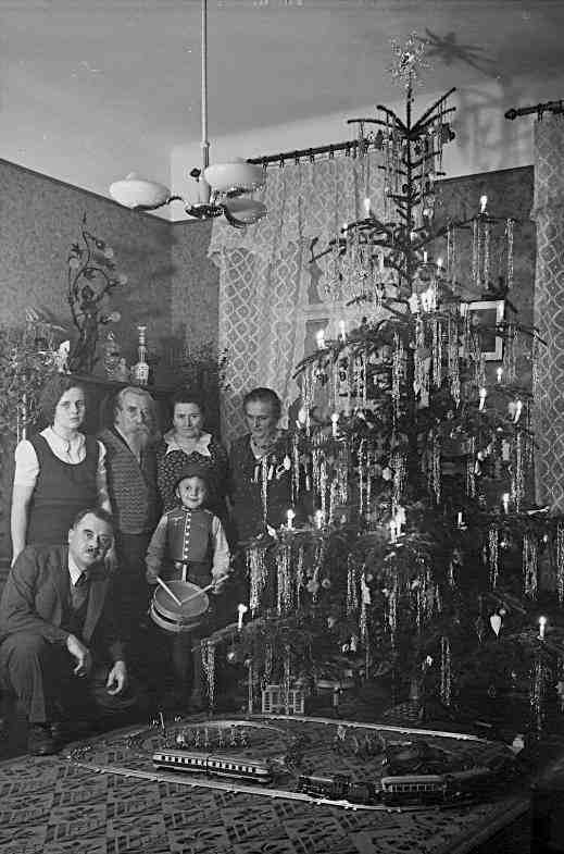 Several individual German family Christmas trees are archived on HBC. Most show dark tree. We think that this is because, German families did not commonly light their trees, except for brief periods with mostly wax candles, until after World war II. We see Rosemarie with her brother beside the family Christmas tree, we think in the late 1920s. I think I see a candle, but it is not lit. We note an unidentified boy in front of the tree in the 1930s. The candles are all lit.