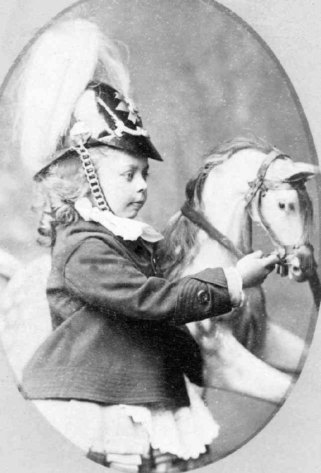 Available Scottish portraits are quite similar to the English portraits that we have noted. we note no destinctive clothing or differences in the hobby horses. Clearly hobby horses were popular throughout the United Kingdom as well as British Empire countries. The portrait of the Scottish child here is quite interesting. Thehobby horse is a wonderful one. Clearly any small boy would become very attached to it. The child looks to be wearing a dark jacket with military styling over a lacy white dress. The hair is done in ringlet curls. We believe that the child isprobably a boy, primarily because of the helmet. the dress is one that a boy or girl might have worn in the 1880s. The hobby horse is an indicator as it was more common for boys than girls. The helmet appears to be a very accurate is a reproduction of a guard's regiment, I think the Grenadier Guards. Hopefully our British readers will know here.