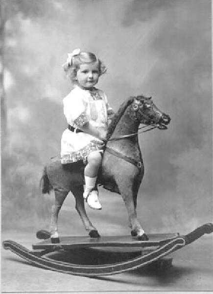 This is an American portrait, probably taken in the 1900s. The the child is unidentified. We are not sure about whether it is a boy or girl. A HBC reader believes that the child is probably a boy, but is mot certain. HBC is not at all certain. Most hooby horse portraits are boys, but girls were also photographed on them. In this case there are no additional props to provide gender clues. At first glance, the outfit looked like a boy's tunic suit, but the pattern trim is unlike any we have seen on a boy's tunic.