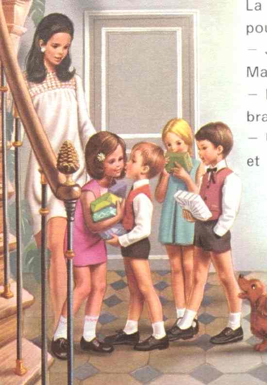 We have little information about the custom of birthday parties in France. We do not know when birthday parties became common events in France and when children began bringing presents. One drawing from famed Belgian illustrator Marcel Marlier shows children exchanging presents. This look similar to American birthday parties with the guests bringing the birthday child gifts. American birthday parties also used to be formal affairs, but this was less common by 1969. The party depicted here looks a little formal. This formality could be just Marlier's rather idealized style of drawing children. One interesting aspect is the children's greeting kissing each other on the cheek. This is presumably common in France. It would be very unsual for American children to kiss like that as a greeting, even if they were close friends. American boys in particular and in fact for school age children up to about 11, birthday parties are often largely single gender affairs.