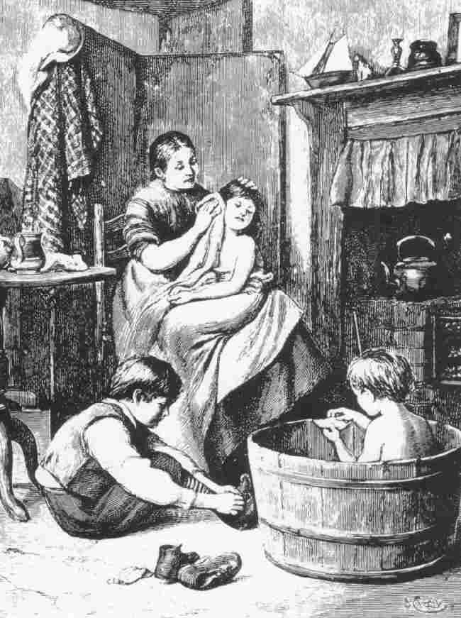 Figure 1.--Relatively few private homes had bathrooms in the 19th century. Gradually the bath became a weekly event, even without a bathroom. Wood barrels were used at first. Then galvanized tubs became common. You can see them advertized in the early Sears and Wards catalogs. We are not sure who did the drawing here, perhaps Brenda Prince. Nor do we know where it was first published. From the clothing a wood barrel we would guess it depicts a scene in the mid-19th century. Mother and the older boy would have to carry the water from a nearby pump. Farmrs would have a pump by the houuse. Town would have had pumps or fountains located throughout the city. The boys would be bathed in the living room or kitchen. Not the kettle which was used to het the water.  |