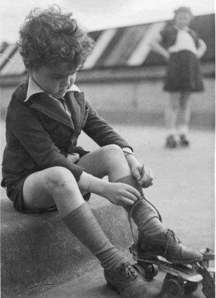 Roller skates are a shoe or boot with wheeles are casters attached to the sole. Most have four wheels, but some are dine sith two. This provides the wearer to skate on snooth surfaces such as pacement. Children skate on sidewalks or other pavements. Entusiasts may go to rinks with especially prepared surfaces. Roller skare boots can be expensive. A less expensive expedient fir children were devices whith the wheels that could be clamped on to the shoes. These were relatively inexpensive and thus easily available for children. Early versions of roller skates first appeared in England during the late-18th century. Imprivenments were made during the 19th century, but it was not until they began to mass produced in America that the cost came down so they could become a children's toy. We see large numbers of children wnhoying roller skating during the 20th century. Many of the available photographs shows boys skating. This caries from country to country. For some reason in America, skating seems to have been particularly popular with girls. In the late-20th century new firms of skates such as in-line skates became popular, but they required a higher skill level that the traditional skates.