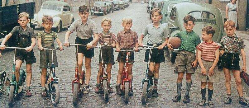 Vehicles were middle-class items if you look at groups of boys, only a few will have sccoters and trikes. They were not commonly available for boys unless they came from a comfortable middle-class family. Grmany was the most industrialized country in Europe. Even so, before World War II, living standards and wages were substantially below U.S. leves. German wages did not support purchases like cars and even more expensve toys like bicycles. This is a matter of soe importance. Henry Ford in the United States not only negan the mass productin of automobiles, but he was the first indusrialist who began to see the worker as a potential customer and ontroduced aliving wage. THis was a factor in the Phenomenal growth OF American industry. This mean that at the time of Wold War II, the United States had an industrial base far beyond that of Germany. This meant that Germany launched a war without a fully mechanized army. America not only fully mechanized its army, but supplied vehicles to its allies. American trucks in particular played a huge role on the Eastern Front. This difference can be seen in the vehicjes with which the children played. German workers did not commonly have cars. Many traveled to work on bicycles. And often they did not wnt their children playing with them because they were expensive items. This all changed after World war II. As strange as it may seem, most Germans benefitted economically by changes made after the War. As a result of the German Economic Miracle, Germans in Western Germany were more prosperousthan ever before. German boys, even working-class boys, by the 1950s did het scooters, tricycles, and bicycles. They became very common play items.