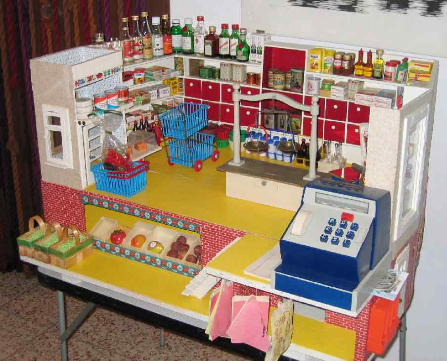 A HBC reader tells us about a family food store thas has developed over four generations. His uncles played ith it beginning 1n 1912, he played with it, his son plsyed with it, and now the grand children are trying to pasy with it. And each generation added a bit to it as time went on. It was seen as a boy toy as girls had their doll houses. It is a delightful piece of social history. A British reader writes, "What a bril toy. Started in 1912 and with additions growing into a super store. Just like a real store. Badge the drinks."