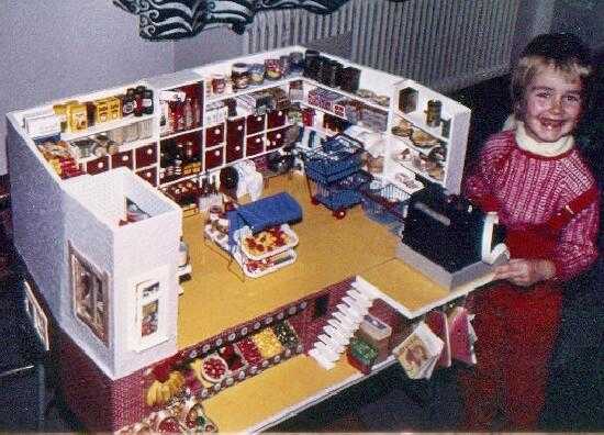 I asked our reader why this was a boy's toy. He explained, "well, in former days, merchants were male, isn't it? For young boys, thus, it was obvious to prepare them. Of course, in playing, boys and girls were clients of the Kaufladen. Girls got doll houses, two room appartments, three room appartments, with citchen, one floor, two floors. Also to prepare them as housewives. Brothers and boys coming to visit the family were included in playing, certainly. My wife's doll house has been lost, only some old, very fine furniture still exists. I will add a photo of her doll house and citchen in an old photo, 1939, three years old. Because girls got the doll houses, some different toy house was prepared for boys - a possible explanation of the difference! - I don't know. In my case, up to the present forth generation, there were boys playing with it. Certainly my mother had a doll house, it is lost, no photo exists. Her brothers played with the Kaufladen. I had no siblings, my son had no siblings. The two girls now playing with it have a young brother, too young for it; and another cousin not living nearby; thus, at the moment only the girls come."