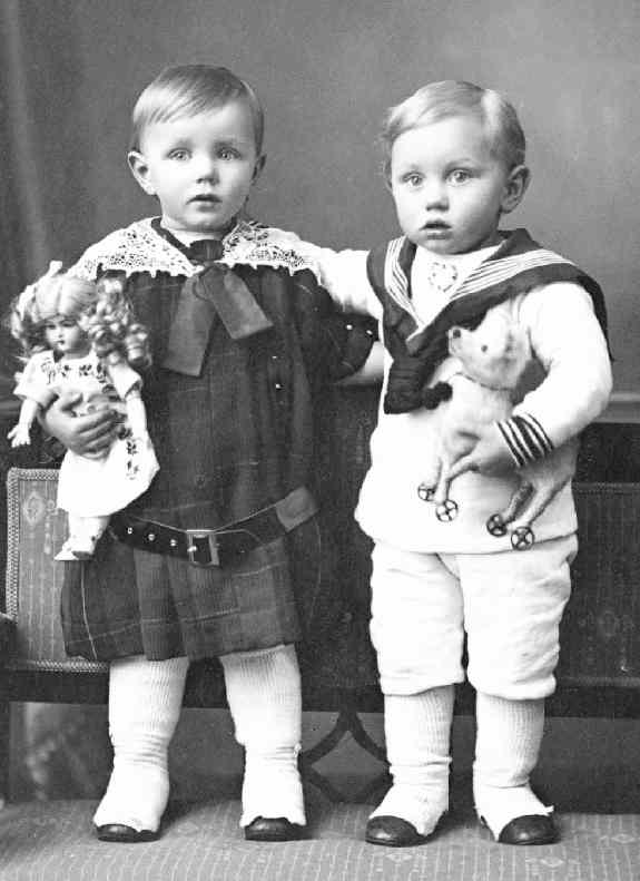This postcard photo is unidentified. but we know it is from Germany. The image is undated and as it is a postacard rather than a cabinent card, the location of where the photo was taken is not indicated. The postcard format, however suggests the early 1900s, probably sometime agter 1905 and before World War I (1914-18). I think they are both boys but cannot be sure, they look to be the same age, but one boy has not yet been breached. He wears a plaid tunic with a pen-on lace collar. One is wearing a dress and one a sailor suit. They look to be about 2-3 years old. We initially thought that these boys might be friends or cousins rather than brothers because of the difference in their clothes. Note, however, that they have identical wool stockings. This suggests very strongly that they are brothers. One boy has a girl doll with ringlers. The other holds a toy. We wonder how these two boys looked on each other's toy. The especially interesting aspect of this image is that it is the older boy that not only wears the tunic (slirted garment), but that also has the doll.