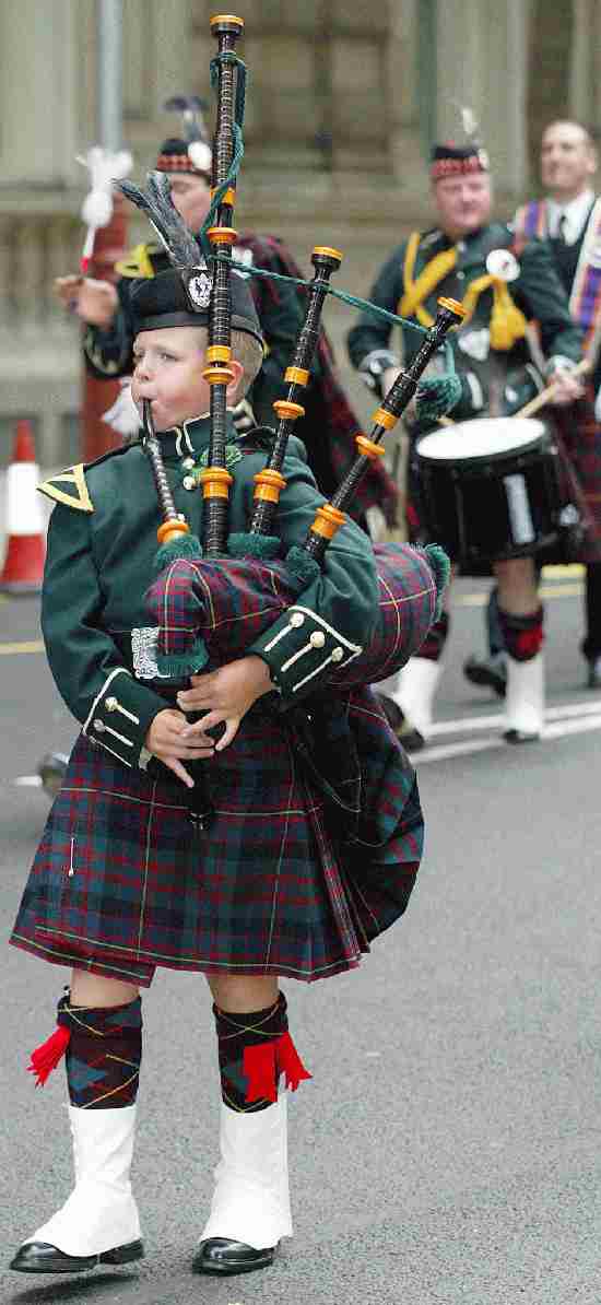 ![]() Figure 1.--This Scottish piper is a member of a pipeband celebrating the Queen's Jubilee in June 2002. Notice how the bag pipe, kilr, and kneesocks all match. I'm not sure which tartan this is. |