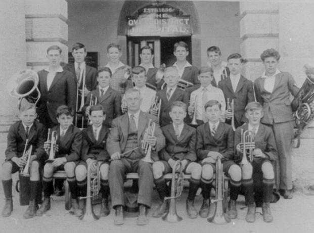 We also note that the Beechworth School had a boys band. It was a rather small band, perhaps the school was very smll. Again we know nothing about the school, but the band looks to be a marching band. The portrait was taken about 1930. I'm not sue if there was a school uniform here. The boys in the front wear similar looking suit and choll kneesocks. Moany of the other boys wear lighter-colored suit , many with open collars. The instruments are all brass instruments used by marching bands. Interestingly, the boys are pictured in front of a hospital rather than thir school. Pehaps they were playing a benefit, but a brass marching band seems rather a strange choice for a hosiptal--certainly not quiet soothing music.