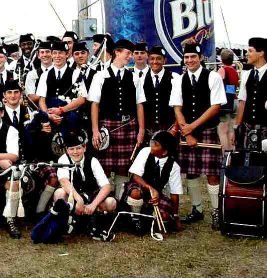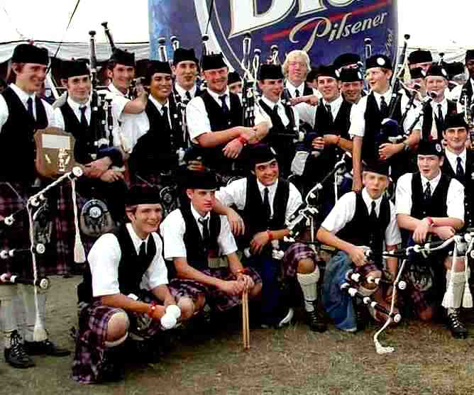 Canada is another country where significant numbers of Scotts emigrated. There is even a province named New Scotland--Nova Scotia. There are of course Scotts in other Canadian provinces. Thus we see a number of Canadian pipe bands. The pipe bands are almost all Scottish as far as we can tell. There was also Irish emigration to Canada, although not on the sam,e scale as the Irish migration to America. I'm not sure just who is sponsoring the pipe bands in Canada. I believe that at least some are sponsored by schools, but have few dertails at this time. There are probably some ethnic organizations sponsoring pipe bands as well. Hopefully some of our Canadian readers will know more. A reader tells us, "The tartan worn here is the 'Hunting Macpherson' or to clansmen it is known as 'The Cluny'."