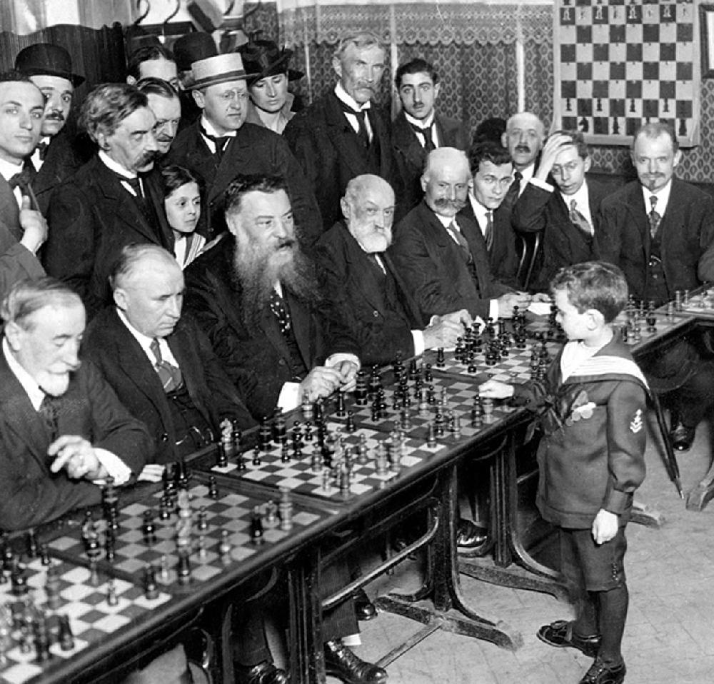 Samuel Reshevsky (1911–1992) was giving simultaneous exhibitions against a room full of adult masters at the age of a mere 6 years., and Reshevsky—while never attaining the title—was amongst the top few players in the world for many decades. Reshevsky was born at Ozorków near Łódź in eastern Poland. His parents were Jewish.