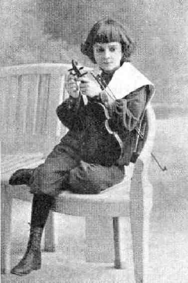 He wore bangs a longish, but not shoulder-length hair. He even still has a childing long hair cut with bangs as an older teenager. The hair style on an older teenager looks rather rediculous today. I have not noted other boys this age wearing such hair styles. It may well have been preceived as rediculous in the 1900s also, but perhaps muscicians were given more leeway in hair styles.