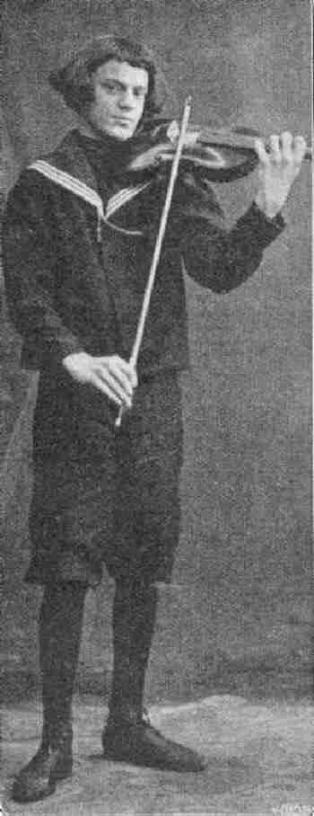 A HBC reader has provided two photographs of a child violin prodigee named Kun Arpad. The name appears to be Hungarian so presumably that was his nationality. We have, however, no information on him. The photographs appeared in De Prins. He must have be born in the 1890s. The available photographs show that he was dressed in kneepants sailor suits. One 1901 photograph shows him wearing a kneepants sailor at about 11 or years of age. He wore bangs a longish, but not shoulder-length hair. He apparently is an example of a boy whose parents wanted him to look like asmall child as long as possible. A 1907 photograph when he looks to be 17 or 18 years old shows him still wearing a kneepants sailor suit. Very old boys in the 1900s wore kneepants suits. (This was true in America. HBC is less sure about Hungary and other European countries. He even still has a childing long hair cut with bangs.