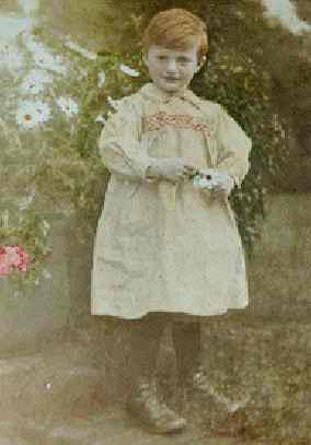 A snap shot talen when he was about 5 years old shows him wearing a smock. The colorized print shows that it was a yellow smock. As this was not an actual photograph we do not know how acurate the colorization was, but presumably some effort was made ro replicate his hair color and smock color. He wears long black stockings with his smock. I'm not sure what kind of pants.