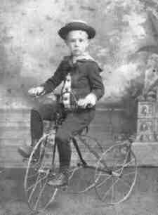 Bikes were originally developed for adults. Bikes at first were quite expensive, too expensive for children. Versions for children appeared by the late-19th century, but because of the cost, these were only for children from wealthy families. After World War I the bicycle became more afordable and in some countries such as America became a standard play item. Boys in particular liked to be photographed with their bikes. Thus many photographs exist of boys in casual clothes with their bikes. Early photographs, however, are staged shots, some times with the boys wearing their sunday best suits. We are not positive about the time-line yet, but I believe tricycles for children became available for children in the 1880s. This was actually before bicycles were available. I believe this was in part because the trikes were inherently safer than bucycles, especially early bicycles. I believe that