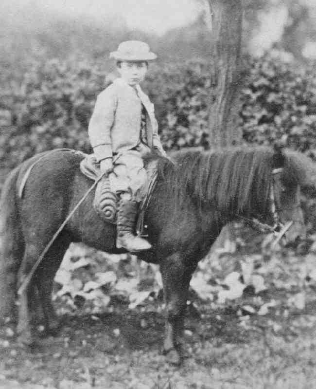 Men from the time of the domestication of the horse have riden astride. This became even more significant with the invention of stirups. This allowed the a rider the support needed to strike a forceful when mounted. European women did not commonly ride astride until after World War I. After the War, woman for the first time would appear in pants. One of the types of pants were jodpurs or riding pants. So dressed it was possible for girls to modestly ride astride. We have noted portraits of boys riding hobby horses side saddle, or at least photographed sitting side saddle. We have not yet noted boys in dresses riding actual horses side saddle. All of the images we have noted when the child has been confirmed as a boy were riding side saddle. There are unidentified images that we are unsure about, as it is so difficult to be sure about the gender of younger children in old photographs. As far the identifed images or images that seem to be definitely boys, all show boys riding stride.