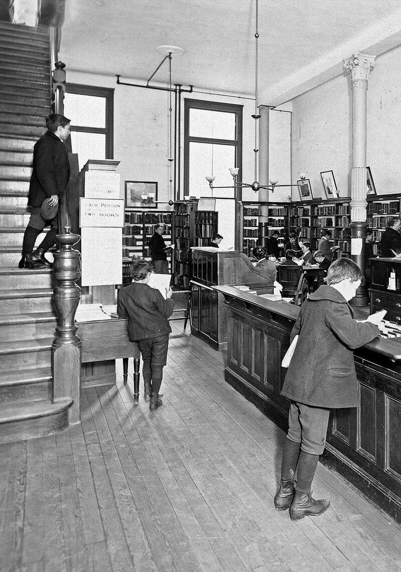 America developed a superb public library system, out classing amy country in Europe. Many people recall getting a library card. That opened up a while new world, searching through the stacks. Libraries today are an important part of modern lide and now are not just about books, but are media centers. Amnerica has led the way in the creation of public libraries. Early American public libraries were established through philanthropic contributions (18th century). From this developed free public libraries (19th century). This was a product of course of feee market capitalism. Andrew Carnege in America played an especially important role in launching public libraries. This allowed even low income families access to books for their children. The photograph on the previous page is from about 1910 of the interior of the Seward Park Library, a Lower East Side neighborhood branch library in New York City. Note the librarian's floor-length skirt and the school children's clothes. The boys, who seem to be about 9 or 10 years old, wear knickers buckled below the knee with long black stockings. The boy speaking to the librarian wears a white shirt with a necktie. Notice also his hightop shoes typical of the period. These are local school children who came to the library for a quiet place to study. They probably lived in somewhat crowded and chaotic houses or apartments on the Lower East Side. Early in the 20th century, this area housed a working-class population occupied by tenement dwellers and sweatshop workers. There was quite a bit of ethnic diversity because the area was largely made up of recent imigrants to the city. The Library helped local families in their struggle to learn English. During the Great Depression some of the library staff spoke Yiddish to help cope with imigrant Jewish families. The Seward Park Library was opened in 1909 and is still operating. At the time of this photograph, it was so new that the book shelves are still mostly empty. It was a branch of the New York Public Library.