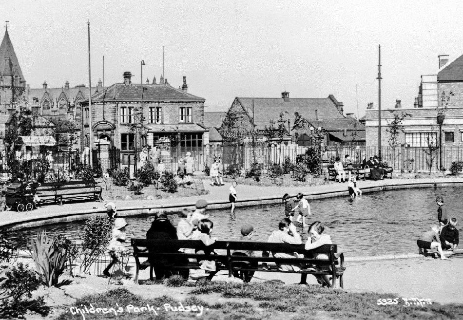 Pudsey is a medieval market town in northern England. It is located in West Yorkshire. It has been incorporated into the Leeds metropolitan aea, but is equal distant between Manchester and Leeds. We see a nice, but not huge paddling pool for younger children in the 1920s which the children seem to be enjoying. It looks perfect not only for paddling, but for sailing sail boats. Park benches along the pool are well suited for parents to keep and eyes on the kids. This may be what is mow called just Pudsey Park which is a beautiful green area. Among other things the modern park has a skateboard area and large playground in addition to an aqurium, botanical gaden, bowling green, pet's corner, mini-footbll area, rose gardn, amd wildlife area. A library is located earby.