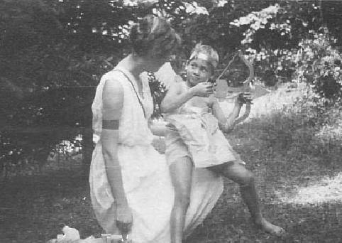 ![]() Figure 1.--Here we see an American snapshot of a costumed woman and a boy with a boy and arrow. Written on the back is "Venus and Cupid from (IRR + Bobby Bradley) the Gods of Olympus at Randolph picnic, August 14, '34." I am not sure just what kind of picnic this was, but apparently there was a costume celebration. |