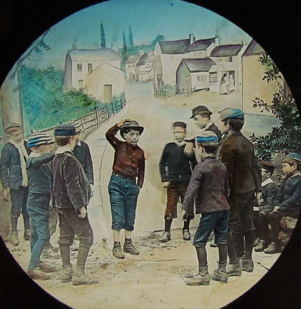 We have heard of all kinds of ring and chase games like tag on the school yard and village green during the 19th century. Here the development of free state schools meant that these games this was much more common as the 19th century progressed and child labor declined. Many of the games have one thing in common, no equipment was needed. Thus everyone could play, poor as well as rich children. Hoop rolling was popular as was horsey and piggy back. Sports began to become important, but nevr reached the mania of modern times. Sports were developing for older boys, but only became widely played in the later-19th century. We have not, yet, however, found much imagery illustrating these fames. Photography was largely studio photography in the 19th century, even the late-19th century. And some of the images we have found do not make it clear what the children are playing. We can only guess, for example, that the boys here are about to play tag (figure 1). This is about the only part of a tag game that can be easily photographed, especially ith 19th century eqyuipment and materials. Other images leave us guessing what the children are doing like this city magic latern slide. Like this other nagic lattern image tke about the same time as the village tag game. Only with the appearance of the snapshot in the 20th century do we begin to get many photographs of children playing and the games they played. Another problem is that the English and other European photographic industriesv were not as developed as the American industry. Here it was largely a matter of economics and aptent law. We believe that there are drawings, but we have not yet succeeded in finding many.